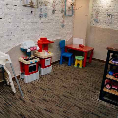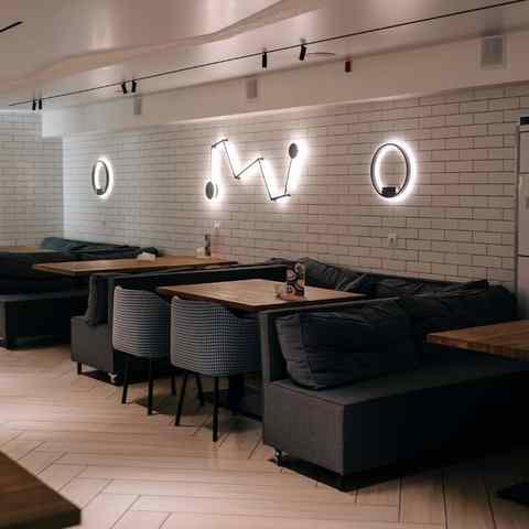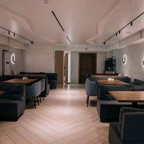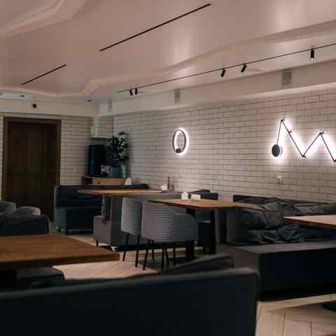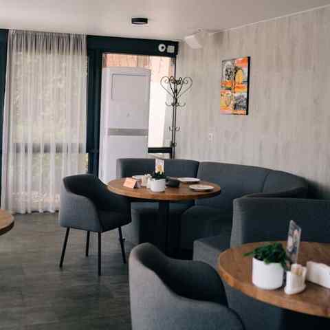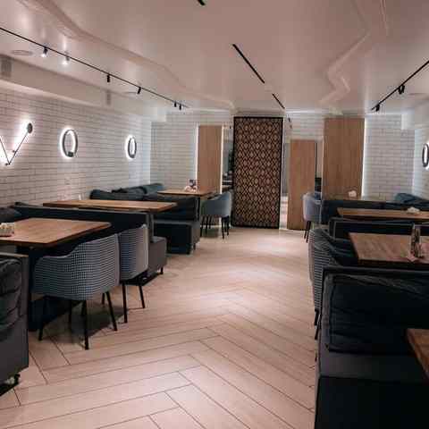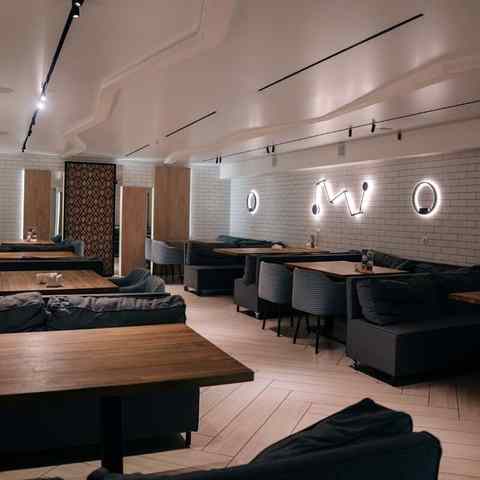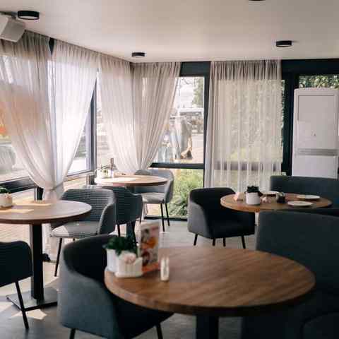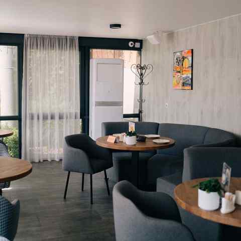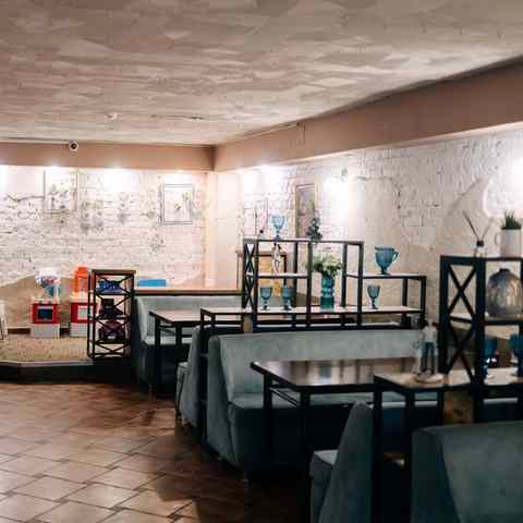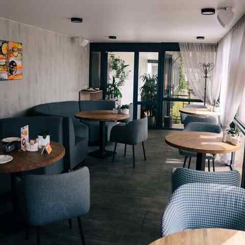 Для комфорта гостей предусмотрены три зала: основной, банкетный и круглогодичная терраса с панорамными окнами и живыми цветами. Интерьер кафе выполнен в тёплых, уютных тонах, мягкий свет и спокойная музыка создают атмосферу уюта и спокойствия. Для маленьких гостей предусмотрена детская зона с игрушками и раскрасками.