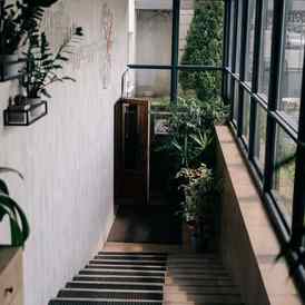 Для комфорта гостей предусмотрены три зала: основной, банкетный и круглогодичная терраса с панорамными окнами и живыми цветами. Интерьер кафе выполнен в тёплых, уютных тонах, мягкий свет и спокойная музыка создают атмосферу уюта и спокойствия. Для маленьких гостей предусмотрена детская зона с игрушками и раскрасками.