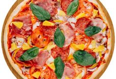 540 г • Ветчина, салями, свежие шампиньоны, свежий перец, томаты, консервированный ананас, свежий апельсин, репчатый лук, зелень, твёрдый сыр, томатный соус, специи, основа для пиццы