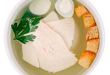 220 г • Филе куриное отварное, бульон куриный, перепелиное яйцо, гренки, зелень