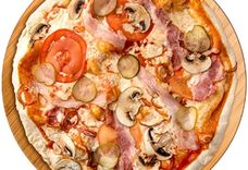 340 г • Копченая грудинка, свежие шампиньоны, томаты, маринованные огурцы, репчатый лук, твёрдый сыр, томатный соус, специи, основа для пиццы