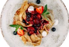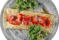 230 г • Блинчики, ягодная начинка, соус сырный крем чиз, клубника