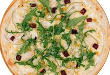 420 г • Моцарелла, груша, сыр сливочный, сыр с голубой плесенью, вяленые томаты, заправка лимонная с мёдом, руккола, основа для пиццы