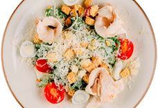 200 г • Филе куриное, перепелиное яйцо, пармезан, черри, гренки, лист салата, заправка цезарь, зелень