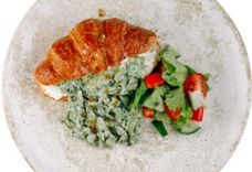 290 г • Круассан, соус сырный крем чиз, омлет скрэмбл со шпинатом, салат, помидор, перец, соус с французской горчицей