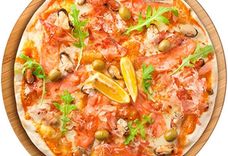 500 г • Филе форели слабосоленое, мидии, оливки, лимон, сушеная стружка тунца , свежая руккола, сушёный орегано, твёрдый сыр, итальянский соус, основа для пиццы
