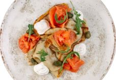 197 г • Блинчики домашние, филе форели слабосоленой, соус сырный крем чиз, каперсы, руккола