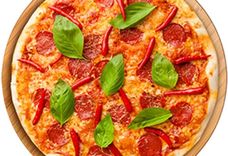 400 г • Салями пепперони, острый консервированный перец, сыр пармезан, свежая зелень, паприка, твёрдый сыр, мексиканский острый соус, основа для пиццы