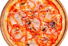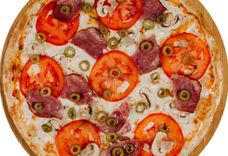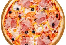 350 г • Ветчина, перец, помидоры, репчатый лук, маслины, твёрдый сыр, томатный соус, специи, основа для пиццы