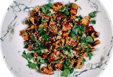 380 г • Картофель по-деревенски, мякоть бедра цыплёнка, сметана, соус сладкий чили, салат микс. помидоры, огурцы, соус терияки, зелень