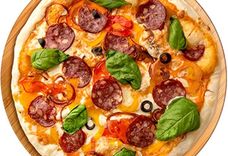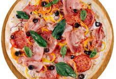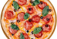 350 г • Салями, помидоры, перец, репчатый лук, маслины, свежая зелень, твёрдый сыр, итальянский соус, основа для пиццы