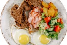 375 г • Яичница из двух яиц, грудинка, хрустящая булочка, картофель по-домашнему, салат, огурец, помидор, бальзамический соус