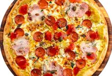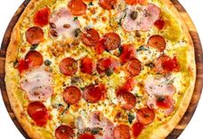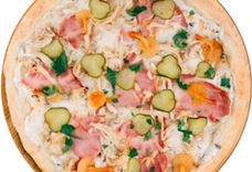 356 г • Грудинка, пепперони, сыр, кисло-сладкий соус, орегано, тыквенные семечки, соус тартар, каперсы, базилик, основа для пиццы