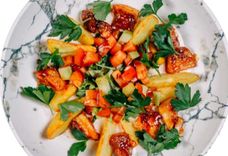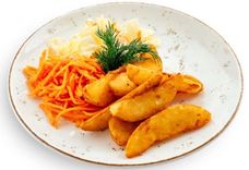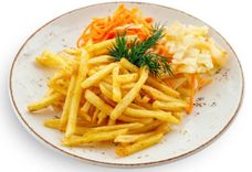 202 г • Картофель фри, салат из белокочанной капусты с растительным маслом, морковь пряная, зелень