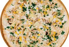 350 г • Куриное отварное филе, шампиньоны, консервированная кукуруза, ананас консервированный, свежая зелень, твёрдый сыр, соус оливковый, основа для пиццы