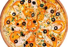 380 г • Основа для пиццы, оливковый соус, сыр, филе куриное, томаты, маслины, зелень