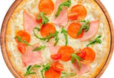 330 г • Основа для пиццы, твёрдый сыр, мягкий сливочный сыр, ветчина, салями пепперони, черри, руккола