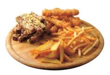 570 г • Картофель фри, крабовые палочки в кляре, чесночные гренки, лук в кляре, соус васаби, кетчуп острый, специи, зелень