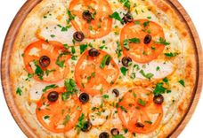 530 г • Основа для пиццы, оливковый соус, сыр, филе куриное, томаты, маслины, зелень