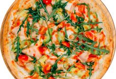 500 г • Основа для пиццы, сыр, куриная грудка, авокадо, черри, сметанный соус, кисло-сладкий соус, заправка лимонная с медом, руккола