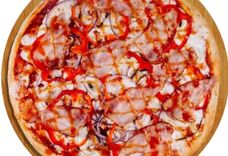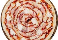 450 г • Копчёная грудинка, моцарелла, соус барбекю, репчатый лук, орегано, твёрдый сыр, томатный соус, основа для пиццы