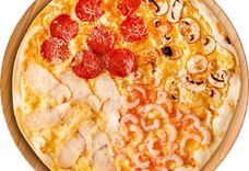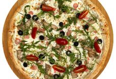 350 г • Основа для пиццы, твердый сыр, мягкий сливочный сыр, куриное филе маринованное, креветки, черри, руккола, маслины, орегано