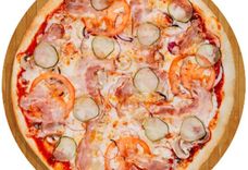 420 г • Салями пепперони, креветки, шампиньоны, обжаренное куриное филе, сыр пармезан, твёрдый сыр, соус сливочно-чесночный, сушеный орегано, основа для пиццы