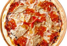 480 г • Копчёная грудинка, куриное маринованное филе, репчатый лук, твёрдый сыр, томатный соус, медовый соус, кунжут, острый консервированный перец, основа для пиццы. Полуострая