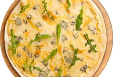 280 г • Сыр твёрдый, сыр пармезан, сыр моцарелла, сыр с голубой плесенью, свежая зелень, специи, соус сливочно-чесночный, заправка лимонная с медом, основа для пиццы