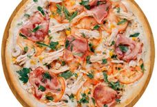 480 г • Куриное отварное филе, ветчина, свежие шампиньоны, томаты, консервированная кукуруза, чеснок, специи, твёрдый сыр, соус оливковый, специи, свежая зелень, основа для пиццы