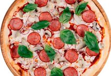 420 г • Основа для пиццы, соус томатный, сыр, салями, шампиньоны, лук репчатый, зелень