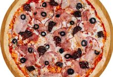 340 г • Основа для пиццы, томатный соус, сыр, грудинка, ветчина, вяленые томаты, маслины, репчатый лук, орегано
