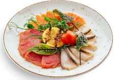 209 г • Филе тунца, филе форели, филе масляной рыбы, черри, лимон, микрозелень
