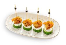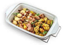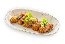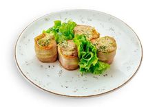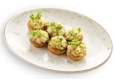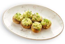 1301 г • Шампиньоны фаршированные ветчиной, шампиньоны фаршированные курицей, шашлык из курицы, шашлык из свинины, куриное филе в беконе, картофель в беконе, колбаски домашние, рулетики из баклажанов с балыком. Блюдо на 6 персон.