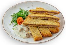 200 г • Свиная вырезка, шампиньоны, помидор, сыр, майонез, лист салата, зелень