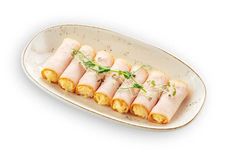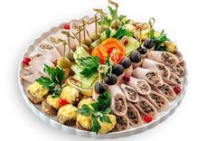 1130 г • Рулетики из ветчины с черносливом, рулетики из ветчины с шампиньонами, рулетики из ветчины в кунжуте, шампиньоны фаршированные курицей, шампиньоны фаршированные ветчиной, руляда, перец, огурец, лимон, оливки, маслины, зелень, клюква. Блюдо на 6 персон.