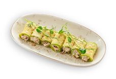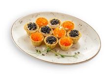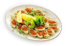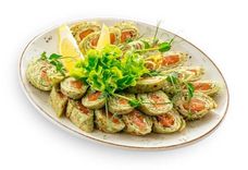 214 г • Блинчики со шпинатом, икра, сыр творожный, черри, лимон, лист салата
