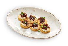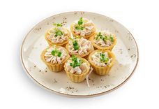 135 г • Тарталетки, куриное филе, лук, сливки, чеснок, черри, микрозелень