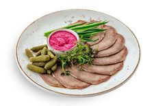 170 г • Язык говяжий отварной, корнишоны, хрен, зеленый лук