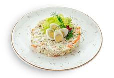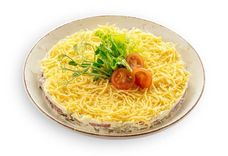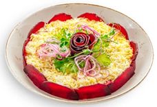 1130 г • Картофель, свекла, морковь, филе сельди, яйцо, майонез, лист салата, зелень. Блюдо на 6 персон