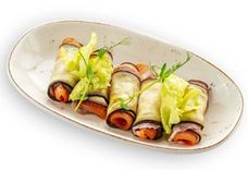 150 г • Баклажаны, помидоры, балык, майонез, сыр, зелень